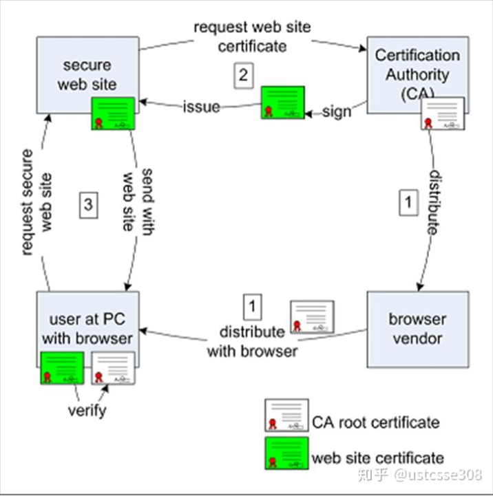 - 用户在访问网站时,浏览器会拿到签名证书,然后验证浏览器身份。